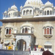 Gurdwara Dehra Sahib was our residence in Lahore. It was here that a Sikh youth of Nankana Sahib, named Azad, took us on a tour of the gurdwaras around Lahore. He first took us to Gurdwara Chuna Mandi in his car. This Gurdwara is two-three kilometers away from Dehra Sahib. Putting the car in one place, we passed through the narrow streets. On the right hand side we saw a huge white milk building in the market which is famous as 'Janam Asthan Sri Guru Ramdas Ji Chuna Mandi, Lahore'. Flower petals are drawn on its front door. Inside, the sanctuary is in the shape of a large hall. Above this Gurdwara there is a large dome and small domes between four smaller domes. The premises of the Gurdwara are covered with black and white marble. We also ate langar in the langar hall below. After this we reached Nakhas Chowk, Lakha Bazaar where Bhai Taroo Singh and Gurdwara Shaheed Ganj Singhanis were located. It was here that I saw the lower-floor rooms where these Singhanis had been imprisoned, and two millstones still there. There is also a very large ancient well nearby. Bhai Taroo Singh was also martyred here. This Gurdwara Sahib has Parkash Guru Granth Sahib and also has a langar for the sangat.