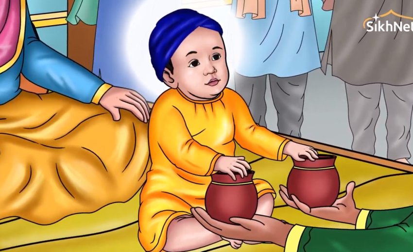 When he met with the baby the old man and the infant seemed to recognize each other. Bhikan Shah placed the two pots in front of Gobind Rai, With his playful spirit, he reached out both hands and put one on each pot. Bhikan Shah became very happy and left the house of the Guru in good spirits.