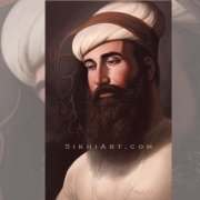The way Shri Hari ji protected the honour of Dropadi ji, He protects the honour of all His Saints. The fabric came from Shri Hari ji and covered Dropadi ji up as she was being dishonoured. In a similar way, in this painting of Guru Angad Dev ji, the fabric emerges from Shri Hari ji, whose symbol is the Ek Onkar, and wraps around the turban of Guru Angad Dev ji.