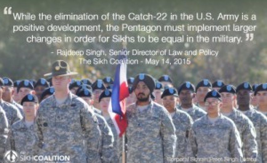 May 14, 2015 (Washington, DC) – In April 2015, the U.S. Army released new rules that will make it easier for observant Sikhs to request religious accommodations for their articles of faith. The prior procedures forced turbaned and bearded Sikh recruits to violate their religion while asking for a religious exception to serve - a Catch-22. Now observant Sikh recruits can continue to practice their religion while the Army decides whether to accommodate their religious articles of faith.