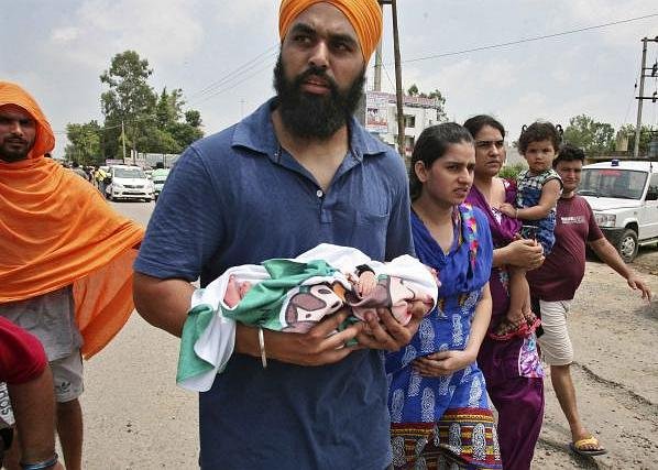 A local resident carries a newborn baby as he walks along with his family after police said they were evacuated from a hospital near the site of a gunfight at Dinanagar town in Gurdaspur district of Punjab, India, July 27, 2015. (Reuters/Munish Sharma) |