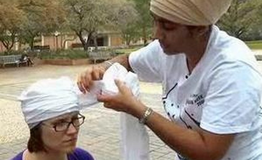 Sikh volunteers swirled blood-red, neon orange and aquamarine cloth around the heads of students as they explained why an item intended to distinguish the Sikh religion has threatened its identity.