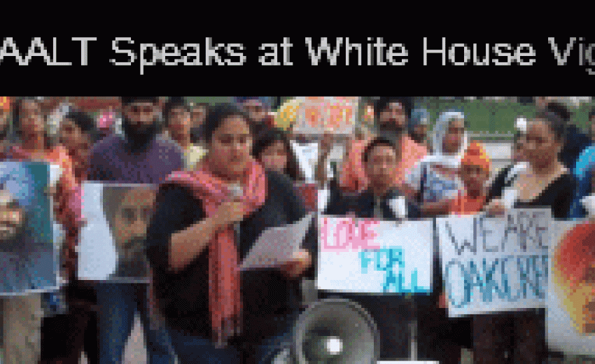 SAALT sentiments read by Maryland Outreach Coordinator, Sadiya Abjani, at the White House Vigil for the Victims of Oak Creek. See more videos here |