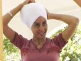 This is a quick casual turban that you might tie if you are around the house or exercising. For some women they tie this one when they get up early in the morning for their Sadhana (banis/meditation,etc). The turban shown in this video is about 3 meters long.