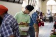 Prabhjot Singh Rathor volunteers to hand out food to community members at the Sikh Temple of Wisconsin, where his father was killed five years ago.