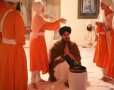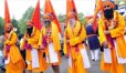 Thousands of people – many in orange turbans, scarves and robes – followed the procession, and handed out sweets and treats to onlookers.