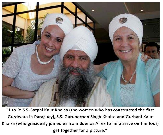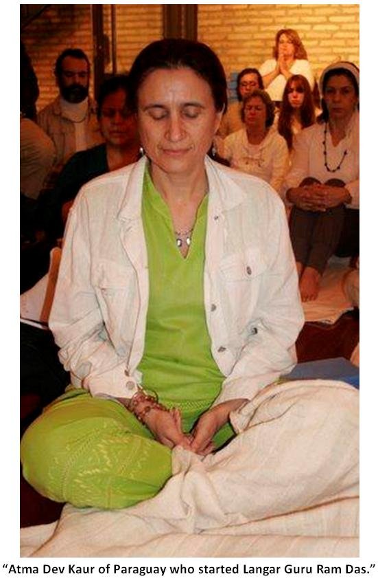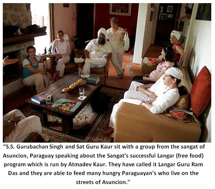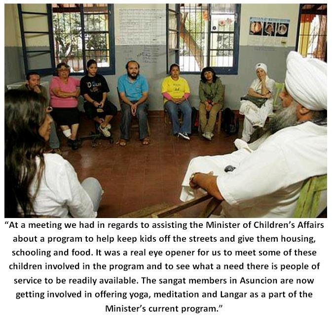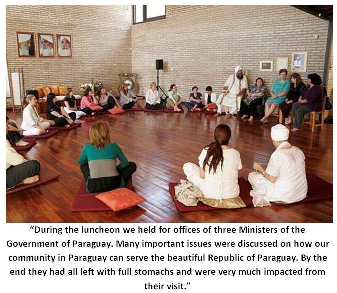 The following morning we were visited by three Ministers of the central government of Paraguay. The Minister of Children’s Affairs, the Minister of Labor and the Minister of Women’s Affairs, Dona Gloria Rubin, with her entire ministerial staff of 15 women. For 2 hours over a beautiful lunch we discussed how we can participate in joint seva projects with their departments. All of the men and women in attendance had many questions on Yoga, Sikh religion and handling stress. It was a wonderful event where we planned to teach in their prisons, work and teach street children, expand our Langar and train their employees in stress reduction techniques through Kundalini Yoga. When everyone left they were uplifted, happy and grateful. Needless to say they were touched by the House of the Guru. And speaking of Langar, Atma Dev Kaur initiated a weekly Langar for street children last year. Every Saturday morning she and a group of fellow sevadars cook wonderful healthy food and serve it on the streets of Asuncion. It is a wonderful seva that they do flawlessly and with a lot of love and heart. It is called Langar Guru Ram Das.