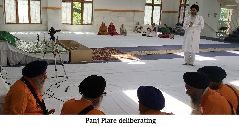 Panj Pyaras deliberated and one of the pyara, Raja Singh, announced the decision in front of the gathered community members that Surinder Singh has to recite Sukhmani Sahib for 11 Sundays and perform langar sewa for 11 Sundays and at the end of this sewa, he must donate 21 dollars and have an Ardas done for his final forgiveness. Surinder Singh in an act of humility accepted the decision of the panel of Panj Pyaras.