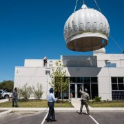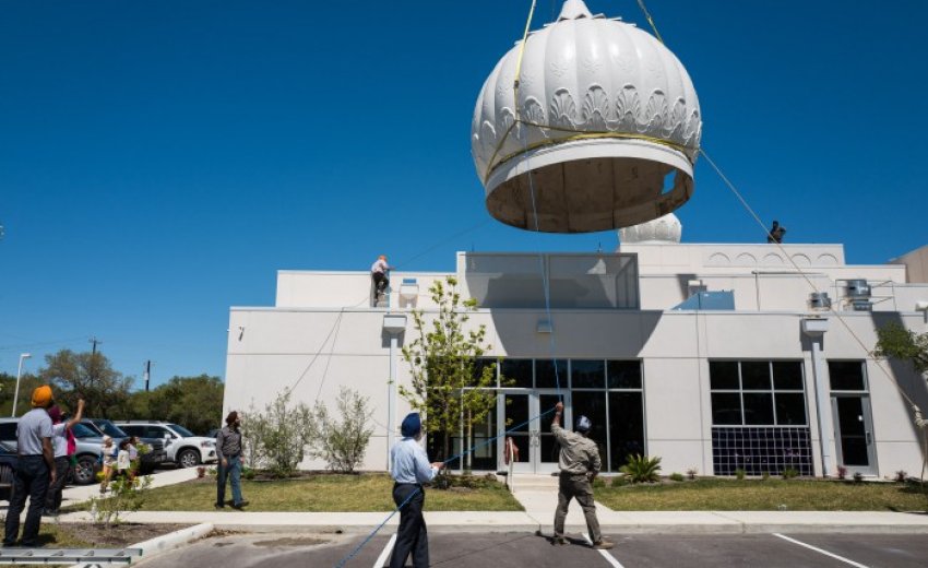 The large fiberglass gumbad is directed by members of the Sikh community as it is positioned above the Gurdwara. Photo by Scott Ball.