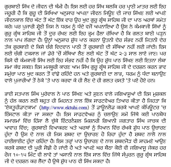 To solve this problem, Bhai Satpal Singh Purewal worked very hard to prepare a software and uploaded it on his website http://www.ektuhi.com . One may easily download this gurbani video tutor (software) from http://www.ektuhi.com and installed in his computer. When this software is run - the Shudh Gurbani Ucharan, keeping in view gurbani grammar and meanings; can be heard in the voice of international missionary Giani Jagtar Singh Jachak who has attended and performed so many Pathbodh Smagms. As the Ucharn (phonetic voice) of the Shabad is heard at the same time the particulars Shabad is continued to be highlighted . This makes very easy to have the full knowlge of phonetic voice as well the spellings of the Shabad. With the help of this software one who has the desire to learn the Shudh Path may learn easily the full Path in a year or so if he managed to spend 10-15 minutes every day.