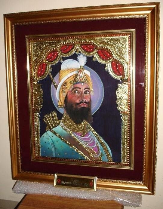 Regarding our mission to present Tanjore Style Paintings to the Historical Gurdwaras . We are pleased to inform you that with Waheguru Ji's blessings, we have now presented a very grand Painting of Sri Guru Gobind Singh Ji (46 inch x 38 inch size ) to Sachkhand Sri Hazur Sahib. Pure Gold Leaf, Semi-Precious Stones, diamond embelishments and vegetable colours were used in making this unique work of art.