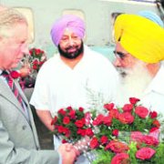 Punjab Information and Public Relations Minister Sewa Singh Sekhwan presents a bouquet to Prince Charles as former Chief Minister Capt Amarinder Singh looks on at the Patiala Aviation Club on Monday Punjab Chief Minister Parkash Singh Badal with Prince Charles at a function at Punjab Raj Bhavan in Chandigarh on Monday