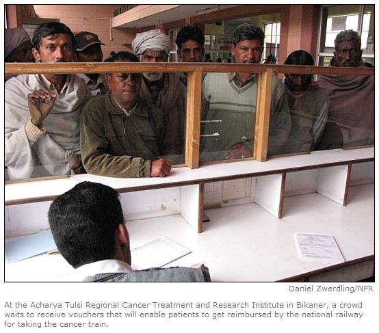 Soon, scores of them are crowding the hallways of the Acharya Tulsi Regional Cancer Treatment and Research Institute. There is a long line at one counter to get appointments. A crowd presses against another counter, where an employee fills out vouchers that will enable the patients to get reimbursed by the national railway for taking the cancer train.