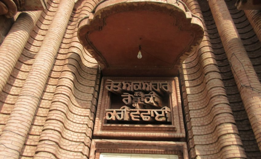 But before arriving in Eminabad, Guru Ji stopped on the outskirts and spent forty (40) days there. The place where Guru Ji along with Bhai Mardana spent this time in quiet meditation, stands a beautiful majestic red brick tiles Gurudwara building called Gurudwara Rori Sahib. The word Rori in Punjabi means pebbles or rocks. This beautiful and awe inspiring building has the domes and columns made from brick tiles cut to size. Even the lettering of words from Bhai Gurdas Ji's Vaar is fashioned out of cut brick.