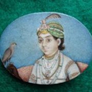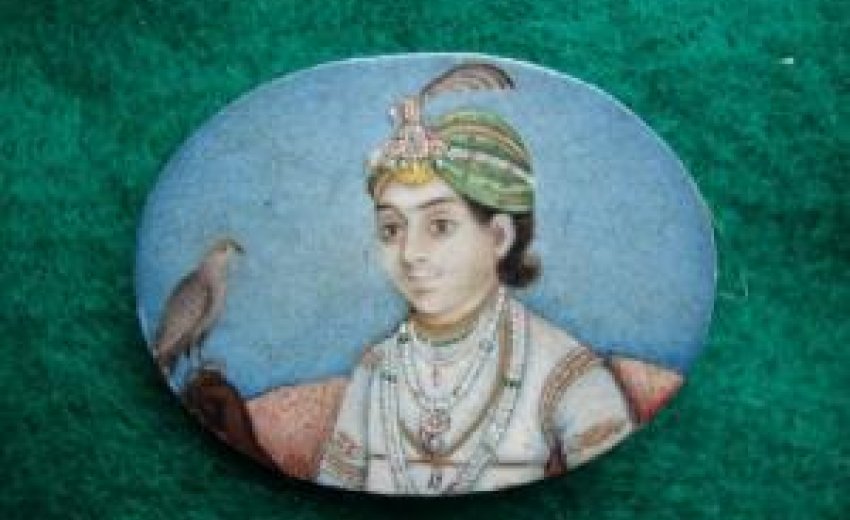 The superb miniature portrait was painted on ivory set in white gold brooch, also inscribed on gold - ‘Runjeet Singh'. It shows the ageing Maharajah looking serious in his full regalia. His left eye is closed - the result of smallpox in his childhood.