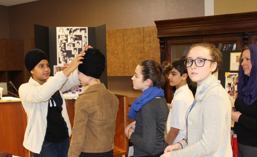 Gurdwaras in Detroit and surrounding areas hosted more than 600 students from 7th grade (axe approximately 14 years) along with their parents to support Religious Diversity Journeys to Sikh Gurdwaras. More than 150 students along with teachers and parents arrived one morning at the Mata Tripta Ji Gurdwara Sahib. After the breakfast, they all were given an overview of Sikhism in the Diwan Hall. After this, students were divided into four groups to attend four breakout sessions of about 35 minutes each. The topics included Dastaar and the 5K’s, Service Project, The Gurdwara and Gatka. During the Dastaar session, turbans were tied as well. An overview of Langar was also presented followed by Langar and question/answer session. Students also learned the importance of service by helping prepare the Langar.