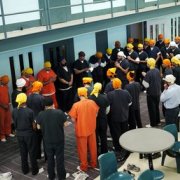 About 70 men in blue and orange jumpsuits are gathered in a large cafeteria, sitting together on flannel blankets. They're almost all from Punjab, India. Bandanas cover their heads. Dressed in business clothes, Balwant Aulck, leads the group.