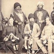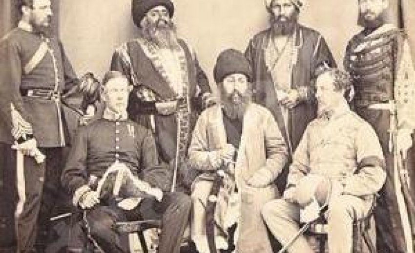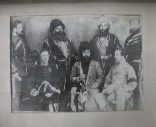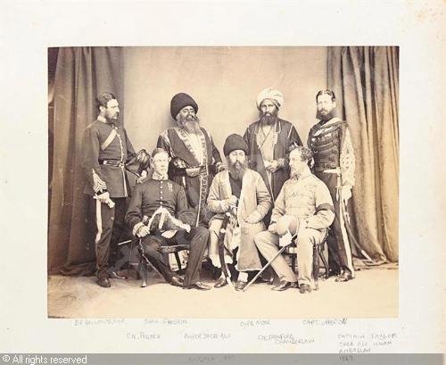 The said portrait is in fact of Sher Ali Khan, Shah of Afghanistan wearing a karakul (black lamb’s wool cap) with Cd. Charles Chamberlain and Sir Richard F. Pollock. It is a camera picture taken at Ambala Durbar held in 1869. Amir Sher Ali Khan’s eldest brother Akbar Khan Muhammad had led the attack in which General Hari Singh Nalwa was martyred. Maharaja Ranjit Singh had died at the age of fifty nine in 1839 and Hari Singh Nalwa two years earlier in 1837. This photograph was taken thirty years later in 1869.