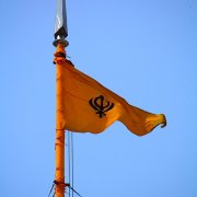At most Gurdwaras, you'll find the Nishan Sahib flying high on a tall pole covered in fabric that matches the flag's color. It's topped with the Khanda symbol. The Khanda is made up of a double-edged sword in the center, surrounded by a circular chakkar, and flanked by two single-edged swords, called kirpans.