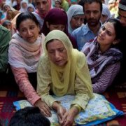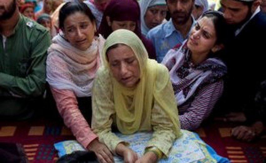 A mother waited for the body of her son to arrive last week at a funeral in Srinagar, Kashmir.