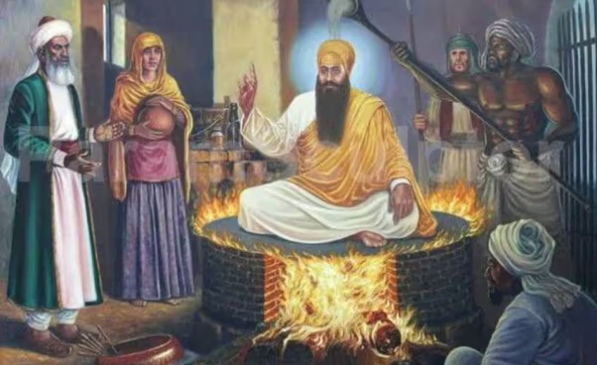 Guru Arjan blessed Jehangir's rebellious son Khusrau, which angered the Mughal king, leading to his immediate execution order. He underwent excruciating torture: he was made to sit on a burning plate while hot sand was poured on him, followed by immersion in the river and five days of continuous torture until his death. In summary, he was burnt alive for supporting the emperor's rebellious son.