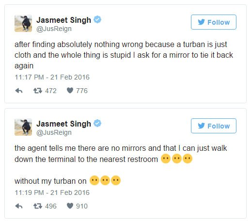 "So the [agents] made me take off my turban in extra screening or they said I wouldn't be able to be let through to catch my flight," he wrote.