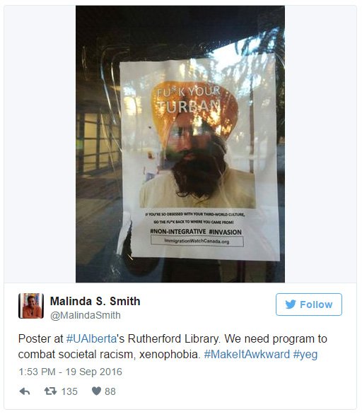 “We’ve seen a huge outpouring of support from the community, the U of A community and the ethnic community at large,” Arundeep Singh Sandhu, a spokesperson for the World Sikh Organization, said on Tuesday. “Even the prime minister has come out against it, the mayor, as well as of course everyday Edmontonians and Canadians have come out against it.