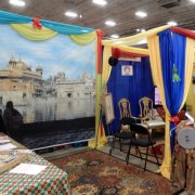 The display included a thoughtfully designed large poster that provided information about the Sikh faith; a hand carved and painted wooden screen with images of dancing women in festive Indian attire. There were carpets on the floor and Punjabi Phulkaris and other embroidered and embellished table cloths that adorned the space. There was information literature about Sikhs and a drawing of The Golden Temple by Indiana artist KP Singh. Throughout the three days of the International Festival, in a carefully choreographed area with gilded chairs and an oriental carpet on the floor welcomed guests, and a large TV under a canopy of red and gold strung fabric drapes showed breathtaking videos of Harmander Sahib, and introduced guests to Punjabi Bhangra, Ladies Giddha, and other facets of Sikh faith and Punjabi culture.