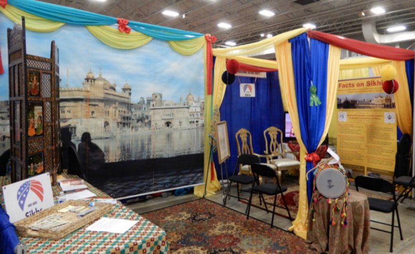 Indianapolis, Indiana USA - November 11, 2018: The Sikh Educational & Cultural Society of Indianapolis participated in the Indianapolis International Festival at the State Fairs Ground Nov 8, 9, 10. This is the 42nd year the Nationalities Council of Indiana has organized the International Festival which was attended by thousands of Indiana and other Midwest school students, teachers, and residents from across the State of Indiana. More than 50 organizations representing various countries and cultures set up beautiful booths to showcase their cultures. The Sikh Educational and Cultural Society of Indianapolis participated for the second consecutive year with an elegantly-embellished booth that featured a beautiful large photo of Harmander Sahib (The Golden Temple), the holiest shrine of the Sikh faith, a celebrated World Heritage Site in Amritsar, India as the centerpiece of their display.