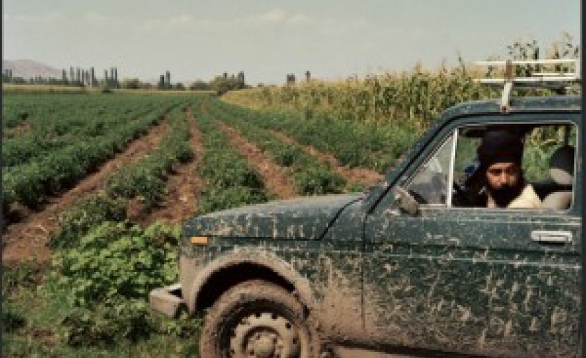 | Ivor Prickett/Panos Pictures Jagsir Sekhon Khan took a break from harvesting sweet corn from his small plot in Gardabani, a town near the Azerbaijan border. He said he intended to sell the corn as maize at a farmers’ market. August 2013. |