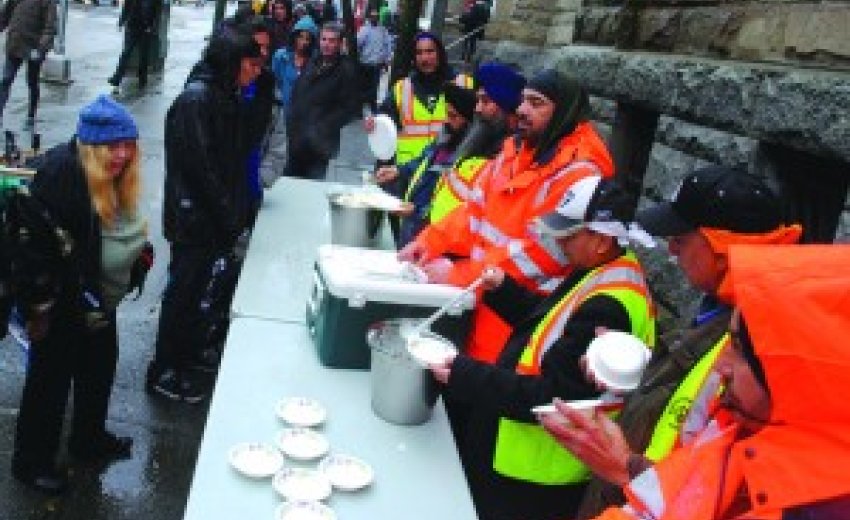 Vancouver-Sangat (28K)Saturday, December 8th, 2012 : VANCOUVER – Sikh community charity group “Vancouver Sangat” started food service program for the needy in downtown Vancouver last weekend. After several years of successfully feeding thousands in need, Guru Nanak’s Free Kitchen (GNFK) brought a great deal of respect for the community and much appreciation from those it served. The food was prepared at the New West Gurdwara and the program grew from just a handful of volunteers and limited resources to one that is greeted with a line-up of hungry people waiting for food every Sunday at Main and Hastings. The program set an example and encouraged others to get involved.