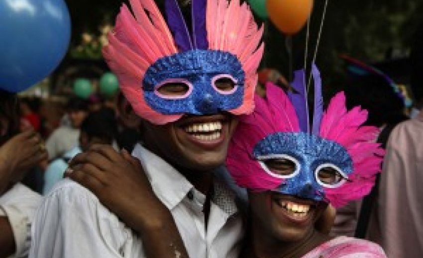 An Indian supporter of lesbians, gays, bisexuals and transgenders (LGBT) community wears a mask during a march in Chennai, India, Sunday, June 30, 2013. Members of LGBT participated in the march to demand for their recoginition and rights and to uphold the Naz Foundation 2009 verdict that read down the IPC Section 377 to exclude consensual relationships among adults of the same sex. (AP Photo/Arun Sankar K.)