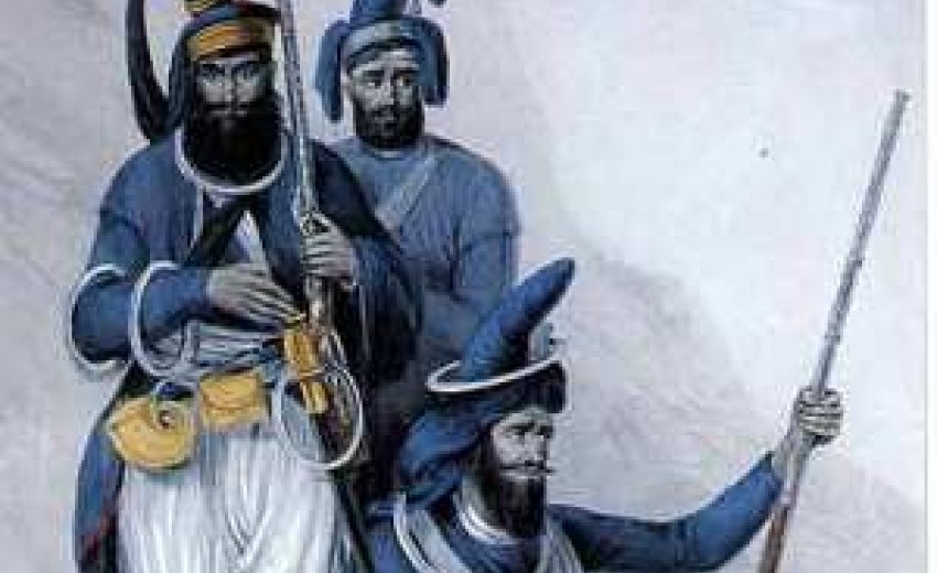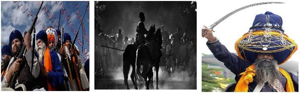 When the Sikh Empire was being established two hundred years ago, swords were used in hand-to-hand combat. Sikh commandos called Nihangs, who fought these dangerous battles, were created by the Tenth Guru. Like the Christian Crusaders and the Muslim Ghazies, they were spiritually motivated fighters who staged do-and-die battles with tenacious zeal. Even today, you can recognize bands of Nihangs by their bright blue clothes, bangles of steel on their wrists and bands of steel in their tall blue turbans. They still carry swords, shields and spears along with iron chains.