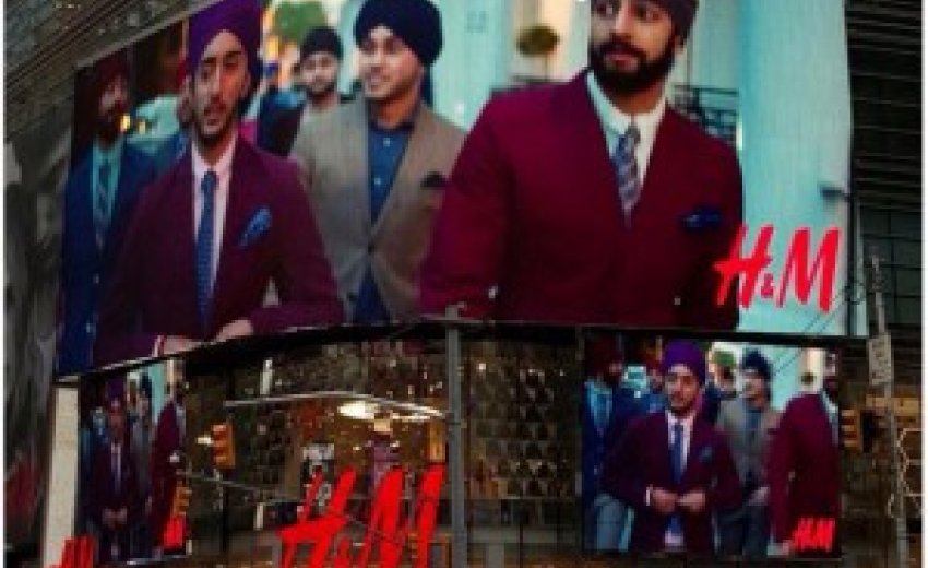 The ad also featured eleven Sikh men in suits and multicoloured turbans. Those men, as Twitter user Khaled Bey has noticed, are now prominently featured on a billboard above an H&M store in New York City.