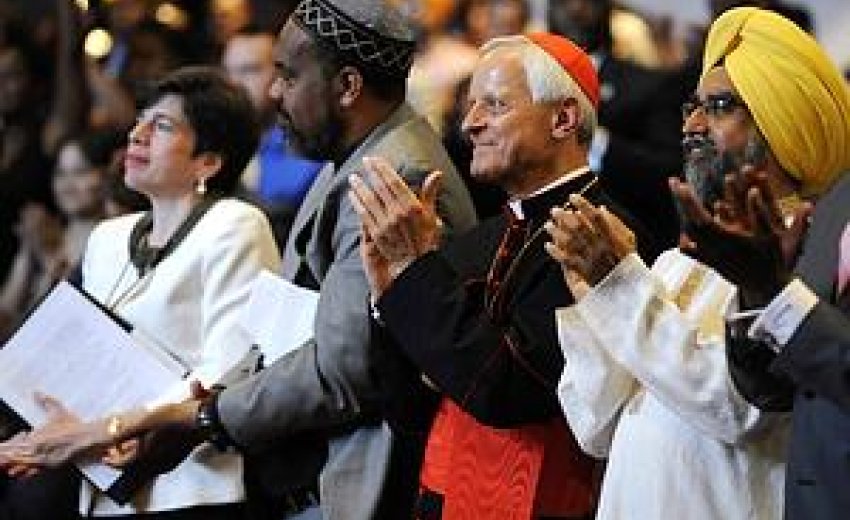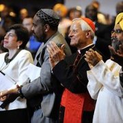 | Rabbi Schonfeld from NY, Imam Majid from VA, Cardinal Wuerl, Dr. Rajwant Singh and Pastor Wanrock from Atlanta during an interfaith service marking the 50th anniversary of the March on Washington on Wednesday at Shiloh Baptist Church in the nation's capital. (Pic by CNS/Matthew Barrick) |