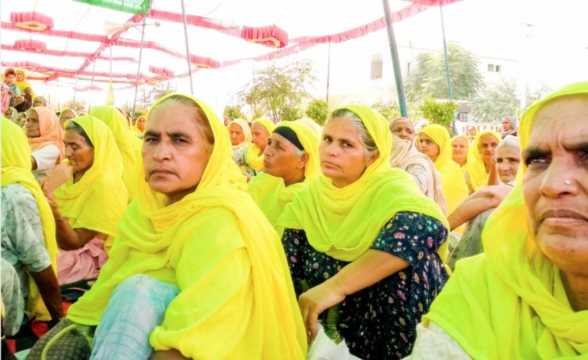 Photo is of women farmers at a protest in Punjab in October 2020. Image by Kanupriya via Editor Gol Monitor.