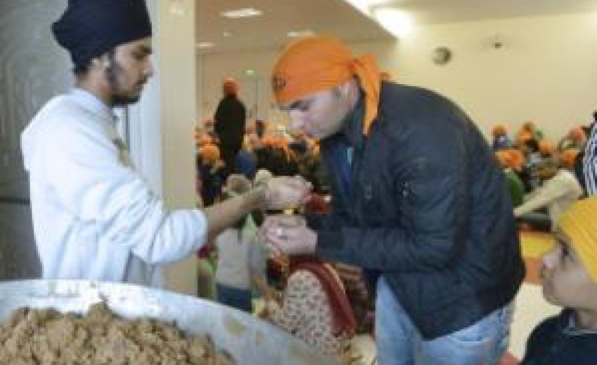 | Agence France Presse Faithful from the Paris Sikh community receive the "parshad" (a wheat flour, butter and sugar semolina halva) in Paris |