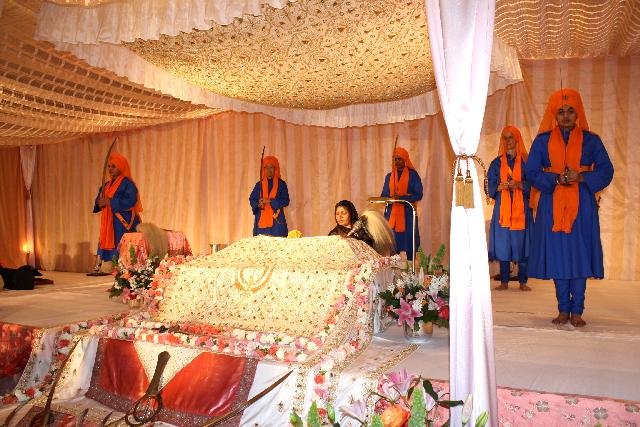 A reverent and ceremonial police-escorted motorcade of the Siri Guru Granth Sahib Ji then followed, with a procession of many cars, to the Convention Center. The transformation of a West Hall Convention Center meeting room into the breathtakingly beautiful Gurdwara and Kirtan Darbar , in soft, delicate hues of pink and peach, designed and executed by master artists Seva Kaur Khalsa and engineered by her husband Jai Pal Singh Khalsa, awaited the arriving Sadh Sangat.