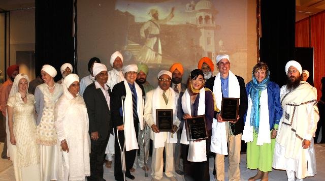 The miracle of Baisakhi unfolded over the course of the next 10 hours. The Kirtan Darbar portion of the program was filled with the vibration of the Guru’s bani; commencing with the sweet sounds of the childrens’ jettas, continuing with more than 20 local ragi jethas, and culminating with a powerful and uplifting finale of 5 jethas combined under the direction of Master Ragi Professor Ranjit Singh of the Mardana Academy of Classical Indian Music. In between, the masterful sounds of Bhai Nirmal Singh and Jetha resounded and filled all with cherdi kala, and afterward Bhai Sahiba, BibiInderjit Kaur Khalsa, wife of Harbhajan Singh Yogiji presented Bhai Nirmal Singh ji and Jetha with a “Spirit of Baisakhi Award” in acknowledgement of their lifetime accomplishment and inspiration through shabd gurbani kirtan. Additionally, the “Spirit of Baisakhi Award” was given to the founder and director of the Maharaja Duleep Singh Trust and the Anglo Sikh Heritage Trust, Harbinder Singh of Great Britain for his work in serving to bring to public awareness and ‘rescue’ many of the Sikh artifacts in British Museums from the era of British rule of India that have been all-but-forgotten.