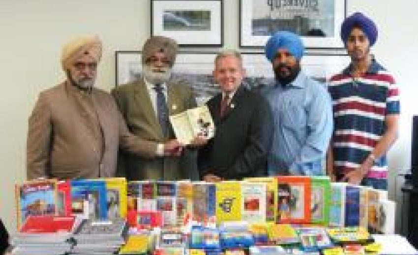 | (L. to r.); President of the Sikh Awareness Society Dhan Singh, Project Leader Jagir Singh Bains, Councilmember Jimmy Van Bramer with Society members Satwinder Singh Sandhar and Lakhvir Singh Sandhar pose with donated books and school supplies. |