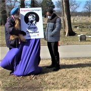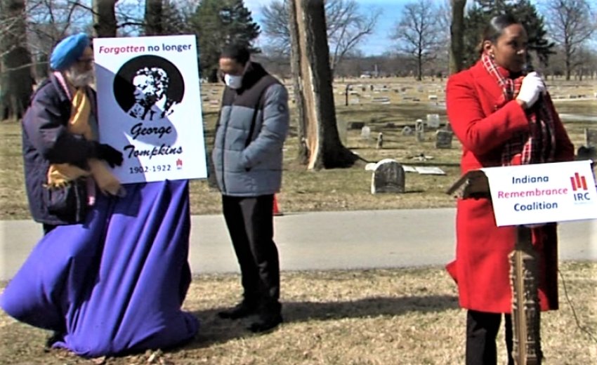At the Graveside Ceremony and under a sunny Indiana sky and with a cold wind blowing across the Floral Park Cemetery: The Dedication of a new marker in honor of George Tompkins was led by The Reverend Nicole Caldwell-Gross and a song by Minister Bambi Dupree-Alridge. KP Singh, Interfaith leader, and Kenyon Jackson, Arsenal Technical High School Scholar had the honor of Unveiling of the new Headstone. After all the gathered guests had solemnly placed flowers at the site, the traditional Benediction followed. This event was organized by several organizations.