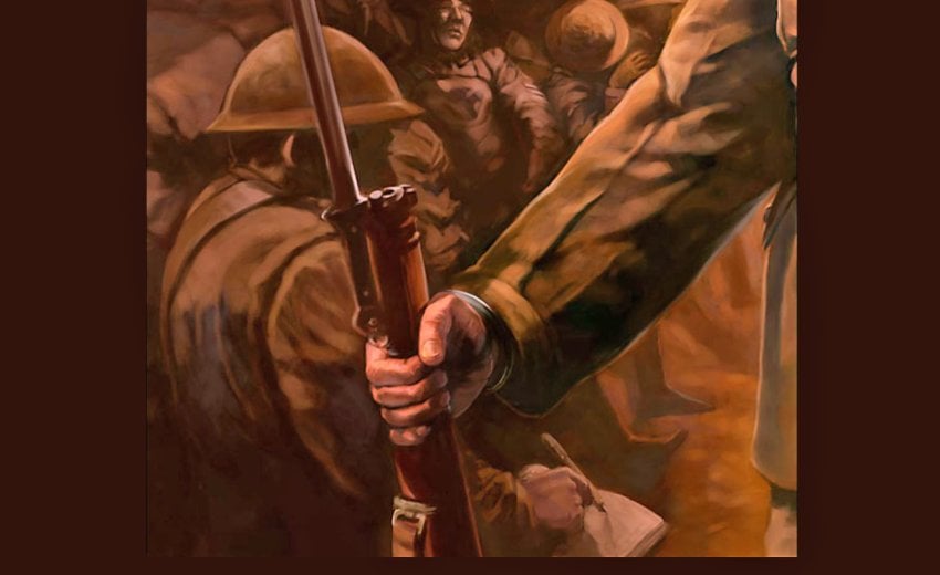 In "Stand on Guard for Thee" artist Kanwar Singh (artofpunjab.com) focuses on the role of Sikhs during World War One. Sikh soldiers participated in most of the key battles of the Great War, whether in the trenches of France, or the deserts of Mesopotamia. To mark the 100th Anniversary of World War One, the artist drew inspiration from the emblematic story of Bukham Singh, a farm labourer living in Canada, who volunteered for Canadian Expeditionary Force in the spring of 1915.