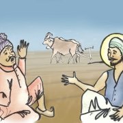 One day, the pundit walked by Dhanna's hut. Dhanna ran out excitedly, "Pundit ji, I can't thank you enough.Thakur is the best! He sings the most beautiful songs!" The pundit was confused and asked, "Your Thakur sings?" Dhanna said, "Oh yes, and he makes the best lassi too. And look, he even helps me in the fields!" Sure enough, the plow in the field was moving but the pundit couldn't see anyone driving the cows.