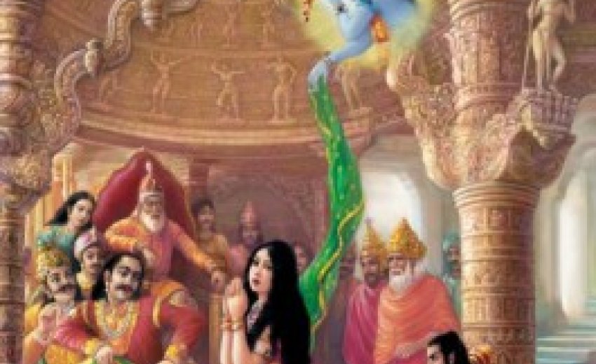 To further humiliate and provoke the Pandavas, Duryodhana commanded his brother to strip Daraupti stark naked. Feeling completed dejected and sexually exploited, Daraupti felt helpless. She closed her eyes and invoked Krishna to come to her aid and save her honour.