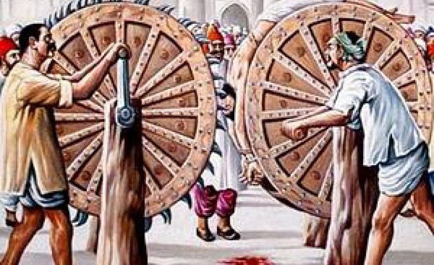 Subeg Singh and Śāhbāz Singh are chained to a large wheel, back to back, head downwards. Next to them stands the wheel with the large sharp blades that are to tear them up. Again they are asked: