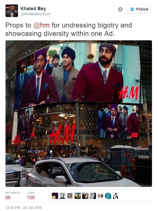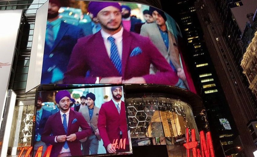 Last year, clothing retailer H&M made headlines for its "Close the Loop" ad campaign promoting consumer clothing recycling. The campaign includes models from all walks of life, body types, and cultures, and one part of the campaign features a row of bearded Sikh men wearing color-coordinated suits and turbans. Recently, these chic Sikh men were displayed on the H&M digital billboard in Times Square, New York City.