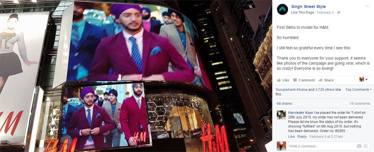 "First Sikhs to model for H&M," he wrote on Facebook last Wednesday. "So humbled. I still feel so grateful every time I see this."
