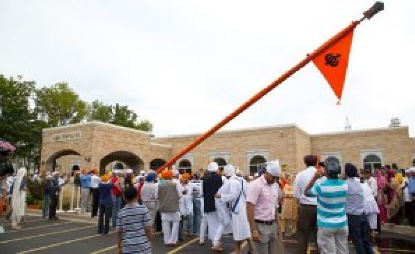 | People gather outside the Sikh Temple of Wisconsin for the raising of the Nishan Sahib flag a week after the mass murder that occurred there. A group of about 50 men and boys unwrapped the orange cloth covering the pole, washed the pole with water and milk and then re-wrapped it with a fresh cloth. (source: USA Today) |