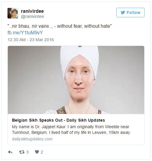 She says: "As a Belgian Sikh, I want to reach out to the grieving masses and say that we should all try not to give in to the fear and anger that these terrorists want to create within us.