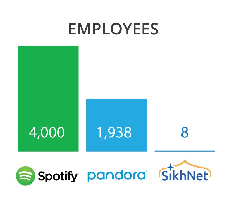 We both provide platforms for music 24/7/365, but they have huge numbers of employees. SikhNet brings you the Gurbani Media Center with just EIGHT employees. That's right - all of it - content, technical backend and support with eight employees.